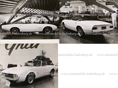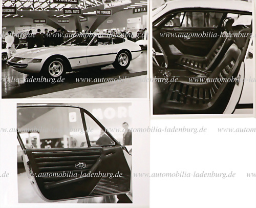 Konvolut 2tlg., Pressemitteilung März 1967 für "Pampero" de Tomaso, einseitig eng. Text, sowie orig. s/w Presseaufnahme 1966 mit gestempelter Rückseite "Carrozzeria Ghia", 12x17,5cm, seltene Aufzeichnungen zu diesem nur einmal gebauten Fahrzeug