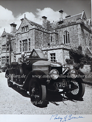 Handsignierte original s/w Lord Montagu of Beaulieu auf Vauxhall Prince Henry vor dem Palast Beaulieu, 24x18cm,