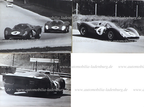 Konvolut 3 original s/w Aufnahmen 1000KM Monza 1967, u.a. Bandini / Amon auf Ferrari 330P4 (#0856), sowie Parkes/Scarfiotti auf Ferrari 330P4 (#0858), je 13x18cm, gestempelt „Attualfoto“