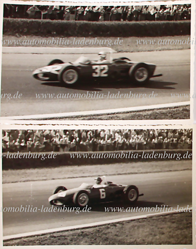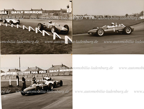 Konvolut 3 original s/w Aufnahmen darunter 2x Giancarlo Baghetti auf Ferrari 156, sowie 1x Phil Hill auf Ferrari 156, 1962 Aintree 200, gestempelt "Wheeler-Roberts", je 16,5x21,5cm