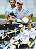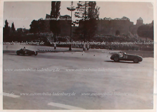 Original s/w Aufnahme Hawthorn auf Ferrari 500F1 im direkten Duell mit Fangio auf Maserati A6SSG, gestempelt "Peter Roberts", 16,5x21,5cm