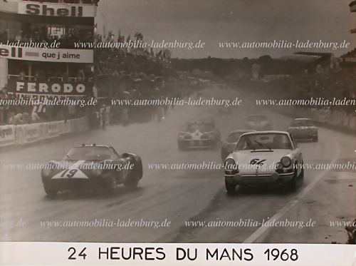 1968, original s/w Aufnahme Paul Vestey / Roy Pike auf Ferrari 250LM (#6053), neben Claude Laurent / Jean Claude Ogier auf Porsche 911 T/R, 24 Stunden Le Mans 1968, 18x24cm