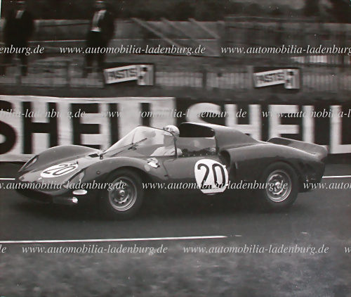 1964, original s/w Aufnahme Willy Mairesse / Herbert Müller auf Ferrari 365 P2 (#0832) 24 Stunden Le Mans 1964, 18x24cm, gestempelt „Photo Actualites Le Mans“