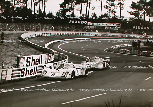 Original s/w Aufnahme Hugus de Fierlant / Alain de Cadenet auf Ferrari 512M (#1030) vor Sam Posey / Tony Adamowicz auf Ferrari 512M (#1020), 24 Stunden Le Mans 1971, 13x18cm