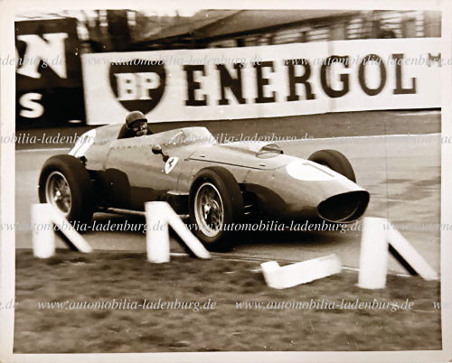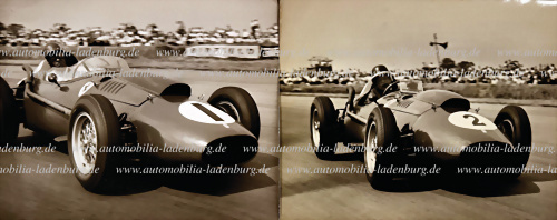 Konvolut 2 original s/w Aufnahmen darunter Mike Hawthorn auf Ferrari Dino 246F1, sowie Rennsieger Peter Collins auf Ferrari Dino 246F1, 1958 Grand Prix England, gestempelt "CentralPressPhotosLtd.", je 20,5x25cm