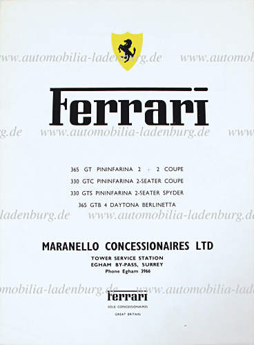 Faltprospekt Maranello Concessionaires Ferrari 365 GT Pininfarina 2+2; 330 GTC Pininfarina 2-Seater Coupe; 330 GTS Pininfarina 2-Seater Spider; 365 GTB/4 Daytona Berlinetta, engl. Text, guter Zustand