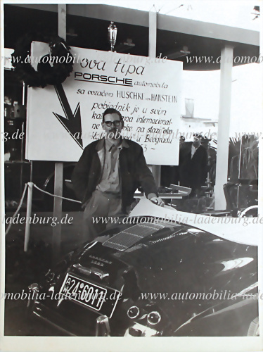Original s/w Aufnahme Huschke von Hanstein auf dem Porsche Stand in "Zagrebacki Velesajam" nach dem Sieg auf Porsche, "Oko Kalimegan" Belgrad 1953, 18x13cm, seltene Aufnahme