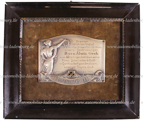 1925 Ehrenplakette "Leipziger Bicycle Club", gewidmet Alwin Groh anlässlich 25. jähriges Firmen-Jubiläum "Dobernecker & Groh", gerahmt 23x27cm
