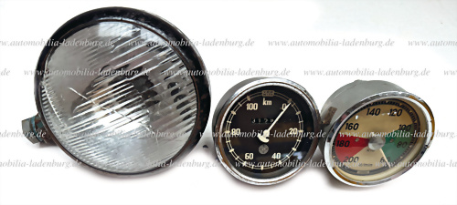 Konvolut 3tlg., darunter VDO Tachometer für Steyr Rückseite datiert „53“; Drehzahlmesser VDO, Rückseite datiert „5,65“, sowie Hella Scheinwerfer (Glas gesprungen)