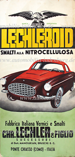 Ca. 1951/52, Lackmusterkarte „Lechleroid Smalti alla Nitrocellulosa“, Titelbild mit stilisiertem Ferrari 212 Inter), u.a. Farben wie Grigio Argento, Azzurro, Rosso Alfa, Amaranto, Rosso di China, Bleu Cobalto, Avorio, etc., seltene Ausführung mit Schriftzug „Lechleroid“ in gelb, kleinere... mehr