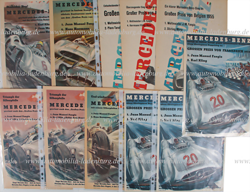 50er Jahre, Konvolut 11 tlg. kleinformatige Rennplakate A4, MB F1 Erfolge, darunter 3x GP von Frankreich 1954; 2x GP von Europa; GP von Italien, Belgien & Argentinien 1955; GP von Berlin 1954; GP der Schweiz, sowie GP von Italien 1954, guter Zustand.