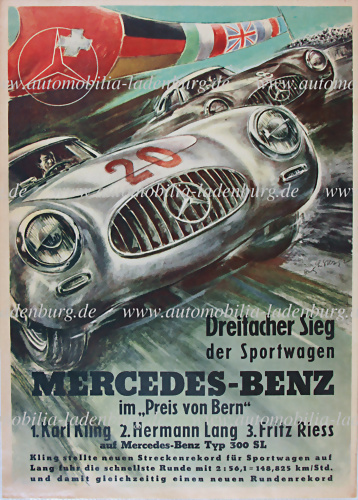 1952, Rennplakat (Kleinformat) Din A4 „Dreifach Sieg der Sportwagen Mercedes-Benz im Preis von Bern auf Mercedes-Benz Typ 300SL“, Entwurf Hans Liska, guter Zustand.
