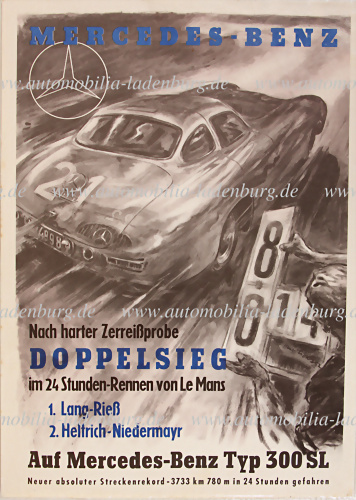 1952, Rennplakat (Kleinformat) DinA4, „Nach harter Zerreißprobe Doppelsieg im 24 Stunden-Rennen von Le Mans auf Mercedes-Benz 300SL“, Entwurf Hans Liska, guter Zustand.