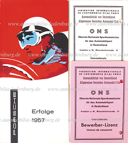 Konvolut 3tlg. darunter Broschüre Porsche Erfolge 1957, dazu Internationale Fahrerlizenz (innen mit Passfoto) Nr. 323 Herbert Linge für die Rennsaison 1957 u.a 12h Sebring auf Porsche 356A 1600GS, Klassensieger Mille Miglia 1957 auf Porsche 356A Carrera... , sowie Bewerberlizenz für die Rennsaison... mehr