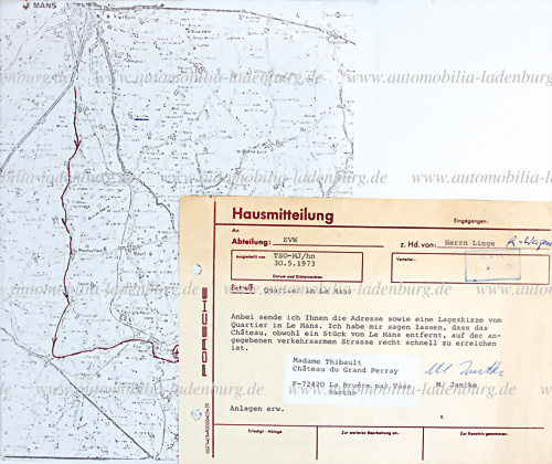 30.5.1973, Hausmitteilung von Manfred Jantke an Herbert Linge betreffend Qaurtier für Le Mans 1973, inkl. Lageplan, handsigniert Manfred Jantke