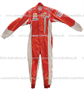 Formel 1 Weltmeisterschaft 2007, original Rennoverall von Kimi Räikkönen, vom vorletzten Rennen der Saison beim Grand Prix Shanghai 2007, vor dem Rennen führte Lewis Hamilton in der Fahrerwertung mit 12 Punkten vor Fernando Alonso und 17 Punkten vor Kimi Räikkönen, alle drei hatten die Chance auf den Weltmeistertitel, während dem Rennen von Shanghai wurde Hamilton vom Team in Runde 31 in die Box gerufen, rutschte jedoch bei der Boxeneinfahrt ins aus, Streckenposten konnten Ihn nicht wieder auf die Strecke bringen und somit musste er das Rennen aufgeben. Räikkönen gelang am Ende der Sieg auf seinem Ferrari F2007, vor Fernando Alonso auf McLaren MP4-22 und Felipe Massa auf Ferrari F2007. Er hielt somit die Weltmeisterschaft für das letzte Rennen beim Grand Prix in Brasilien Sao Paolo offen. Das Rennen in Brasilien gewann Räkkönen vor seinem Teamkollegen Felipe Massa und Fernando Alonso und sicherte sich mit einem Punkt Vorsprung zu Hamilton, die Fahrweltmeisterschaft. Eine schier unmögliche Aufgabe einen 17 Punkte Rückstand in 2 Rennen aufzuheben und sich hierbei die bis heute letzte Fahrerweltmeisterschaft für Ferrari zu holen. Anzug FiA Standard 8856-2000 – RS.075.04 – Puma Manufactur: 2007, historisch bedeutender Rennanzug, Museumsqualität