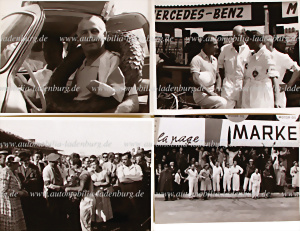 Konvolut 4 original s/w Aufnahmen darunter Karl Kling auf Mercedes-Benz Typ 300 SL Großer Preis von Schweden 1955; 2 Aufnahmen Stirling Moss, 1x in der Boxengasse, sowie eine Aufnahme mit Siegerkranz; 1 Aufnahme des Rennteams in der Boxengasse, 3x 18x24cm, 1x 17x23cm