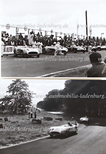 Konvolut 2 original s/w Aufnahmen Strling Moss/ Peter Collins auf Mercedes-Benz 300SLR, 1955 Targa Florio, schöne Aufnahmen, je 8,5x11,5cm