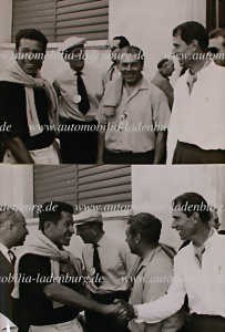 Konvolut 2 original s/w Aufnahmen John Fitch gratuliert seinem Konkurrenten Gendebien zur Zweitplatzierung, unter anderem ist Rudolf Uhlenhaut zu sehen, 1955 Mille Miglia, schöne Aufnahmen, je 17x23cm