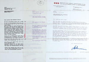 1971/1972, Konvolut 3 Seiten Briefverkehr zwischen Porsche / ONS und Herbert Linge, darunter ein Durchschlagschreiben von Dr. E. Fuhrmann (im Auftrag von Ferry Porsche) an Hans Joachim Bernet (ONS), ein handsigniertes Schreiben von Bernet an Linge, Bernet bedankt sich hier ausdrücklich für den erarbeiteten detaillierten Bericht zum tödlichen Unfall von Pedro Rodriguez (Ferrari)....dazu ein Antwortschreiben von Linge an Bernet, Linge fordert hier "die längst fällige Reorganisation der Streckenabnahme..."