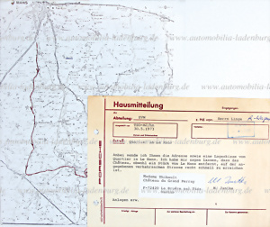 30.5.1973, Hausmitteilung von Manfred Jantke an Herbert Linge betreffend Qaurtier für Le Mans 1973, inkl. Lageplan, handsigniert Manfred Jantke