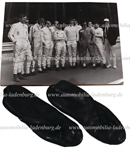 Konvolut 2tlg., 1970, von Steve McQueen handsignierte original s/w Aufnahme mit Widmung an Herbert Linge, das Rennfahrer Team des Filmklassikers "Le Mans bei den Dreharbeiten...von links nach rechts sind Mike Parkes, Dieter Spoerry, Jean Pierre Jabouille, Gerard Larrousse, David Piper, Jonathan Williams, Steve McQueen, Derek Bell, Masten Gregory, Hughes de Fierlant, Herbert Linge, John Surtees mit dem Regisseur Lee H. Katzin zu sehen. Rückseitig beschrieben von Herbert Linge, 29x39cm. Dazu Herbert Linge´s Fahrerschuhe, Linge trug diese Schuhe bei seinem Einsatz als Fahrerdouble für McQueen und als Fahrer des Kamerawagens während dem Rennen (auf dem Foto deutlich zu erkennen)