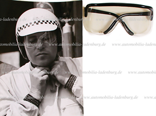1000km Nürburgring 1963, Fahrerbrille, Herbert Linge auf Porsche 356B Carrera Abarth, dazu original s/w Aufnahme Herbert Linge mit Helm und Fahrerbrille in der Boxengasse, 24x18cm