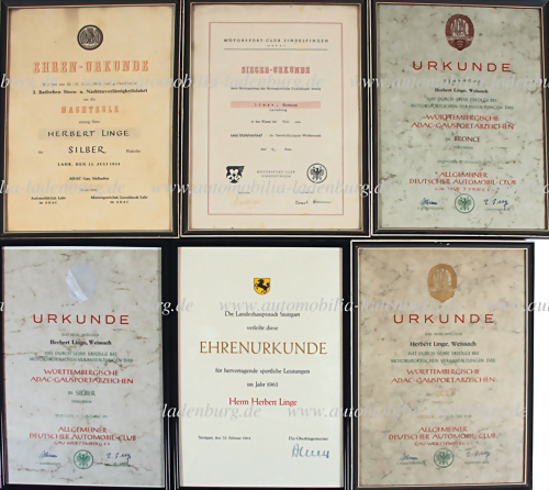 Konvolut 13 gerahmte Urkunden 1954-1965, darunter Siegerurkunde 500ccm Geschicklichkeits Wettbewerb, Württembergisches ADAC Gausportabzeichen 1956 (Bronze), 1957 (Silber), 1958 (Gold), ADAC Sportabzeichen 1959 (Gold), Goldenes AvD Sportabzeichen mit goldenen Eichenblättern 1961, Ehrenurkunde für... mehr