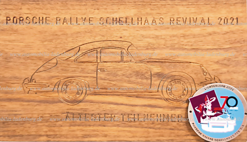 Konvolut 2tlg., darunter Holztafel mit Aufsteller "Porsche Rallye Schellhaas Revival 2021" für den ältesten Teilnehmer, 22x28cm, dazu Plakette