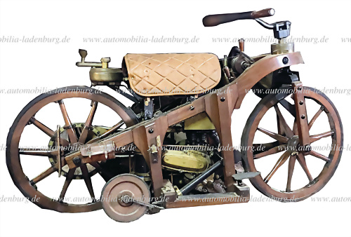 1885, Reitwagen (Nachbau, originalgetreue Rekonstruktion des ersten motorisierten Zweirads der Welt, mit Holzrahmen und Stahlelementen, luftgekühltem Einzylinder-Viertaktmotor nach dem sogenannten „Standuhr“-Prinzip (264 cm³, ca. 0,5 PS bei 600 U/min), Riemenantrieb auf das Hinterrad,... mehr