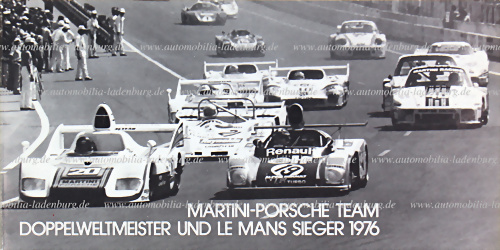 1976, handsignierte Menükarte anlässlich Feier Martini-Porsche Team, Doppelweltmeister und Le Mans Sieger 1976, signiert u.a. von Rolf Stommelen, Jochen Mass, Jacky Ickx, Manfred Schurti; Peter Falk, Herbert Linge, Hubert Mimler; Werner Enz