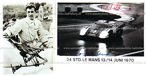 Konvolut 2 handsignierte original s/w Aufnahmen u.a. Werks-Fotopostkarte Hans Herrmann 15x10,5cm, sowie Herrmann / Attwood auf Porsche 917, Le Mans 1970, signiert von beiden Fahrern, 13x18cm