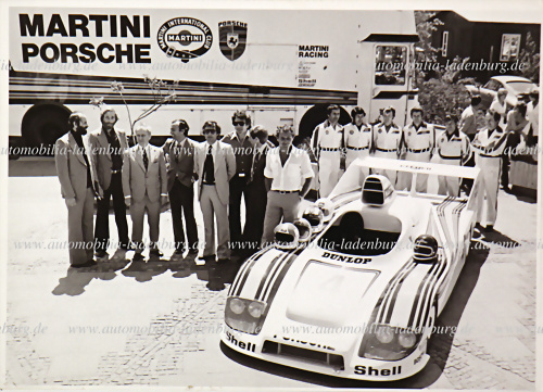 Original s/w Aufnahme Martini Porsche Rennteam 1977, u.a. Manfred Schurti, Rolf Stommelen, Jochen Mass, Jacky Ickx, Henry Pescarolo, Jürgen Barth, 13x18cm, gestempelt "Werner Eisele", schöne Aufnahme