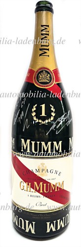 29.08.2004, original Siegerflasche Grand Prix Belgien 2004 Kimi Raikkönen "Champagne G.H. Mumm", signiert und beschrieben von Michael Schumacher "Spa-04 Ferrari GP 700" anlässlich des 700 Grand Prix von Ferrari, Schumacher eroberte sich den zweiten Platz und wurde somit zum 7. und letzen Mal... mehr
