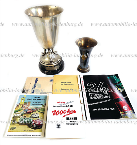 Rennsportjahr 1964, Konvolut aus dem Rennfahrernachlass von Dieter Schmid, darunter 2 Siegerpokale, Dieter Schmid auf Glas, u.a. „Coupe Glas 24 Heures de Francorchamps 1964“ Bodmer / Schmid auf Glas 1204TS für Klassensieg, inkl. Programmheft, dazu Siegerpokal für Klassensieg Nürburgring 1964, dazu... mehr