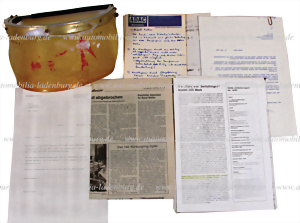 Konvolut, Herbert Müller (Nürburgring 1972 und tödlicher Unfall 1981), darunter das durch die Hitze deformierte Helm Zusatzschutzvisier von Herbert Linge der den brennenden Ferrari 512M von Müller löschte, dazu mehr als 10 Seiten, Aufzeichnungen und Details über den tödlichen Unfall von Müller am Nürburgring 1981