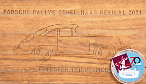 Konvolut 2tlg., darunter Holztafel mit Aufsteller "Porsche Rallye Schellhaas Revival 2021" für den ältesten Teilnehmer, 22x28cm, dazu Plakette