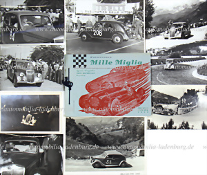 Konvolut darunter Fotoalbum "Fotocronaca Mille Miglia", innen mit 4 original s/w Aufnahmen Gustavo Richter / Antonio Nicolai auf Lancia B20 GT Mille Miglia 1953, dazu 9 weitere original s/w Aufnahmen wie Cara/Cabassi auf Lancia Aprilia Mille Miglia 1951, etc., verschiedene Formate
