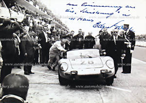 1000km Nürburgring 1963, Fahrerbrille, Herbert Linge auf Porsche 356B Carrera Abarth, dazu original s/w Aufnahme Herbert Linge mit Helm und Fahrerbrille in der Boxengasse, 24x18cm