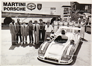 Original s/w Aufnahme Martini Porsche Rennteam 1977, u.a. Manfred Schurti, Rolf Stommelen, Jochen Mass, Jacky Ickx, Henry Pescarolo, Jürgen Barth, 13x18cm, gestempelt "Werner Eisele", schöne Aufnahme