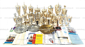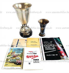 Rennsportjahr 1959-1963, Konvolut aus dem Rennfahrernachlass von Dieter Schmid, darunter 33 Siegertrophäen Dieter Schmid auf Alfa Romeo Giulietta Ti, z.B. Ratisboner Bergrennen 1963; Sudefeldbergrennen 1963 (1.Platz); 1.BSCC Flugplatzrennen 1961; 3. Schorndorfer Bergrennen 1962; Wasgaubergrennen 1963; Nordbeyerische Grenzlandfahrt 1961 (1.Platz); Ampergaufahrt 1961; Rusel Bergrennen 1962; 2, Schorndorfer Bergrennen 1961..., dazu zahlreiche Programmhefte u.a. Wasgau-Bergrennen 1962 (inkl. Ausschreibung); Rusel-Bergrennen 1962 (inkl. Ausschreibung und Trainingszeiten), u..a Furtmayr auf Alfa Romeo, Robert Frank auf Ferrari, Sepp Greger auf Porsche...; 2.BSCC Flugplatzrennen Oberschleißheim bei München 1962 (inkl. Ergebnisliste und Trainingszeiten); 2. Schorndorfer Bergrennen 1961 (inkl. Ausschreibung und Ergebnisliste); 2. Sudelfeld-Bergrennen 1962 (inkl. Ausschreibung); Ratisbona Bergrennen 1961 (inkl. Ausschreibung und Ergebnisliste), u.a. Sepp Greger auf Porsche, Theo Geither auf Ferrari 250, Dieter Schmid auf Alfa Romeo Ti; Raitsbona Bergrennen 1963 (inkl. Ausschreibung und Ergebnisliste); 2x Bergrennen Heidelberg Eberbach (inkl. Ausschreibung und Ergebnisliste); Wallbergrennen 1962 (inkl. Ausschreibung und Ergebnisliste); Ergebnisliste Rusel-Bergrennen 1962; Bergrennen Heidelberg Eberbach 1962 (inkl. Ergebnisliste); 3.Schorndorfer Bergrennen 1962 (inkl. Rennbericht und Ergebnisliste); Großer Bergpreis von Österreich Gaisberg 1962 (inkl. Ausschreibung und Ergebnisliste); Taunus Bergprüfung 1962 (inkl. Ausschreibung und Ergebnisliste); ADAC Bergrennen Happurg 1963 (inkl. Ausschreibung und Ergebnisliste); Alpen Bergpreis Rossfeld 1963 (inkl. Ausschreibung und Ergebnisliste); ADAC Turnier des Mittelrheins Bad Neuenahr 1962; Wasgau Bergprüfung 1963 (inkl. Ergebnisliste); Rheinlandpfalz Bergpreis 1963 (inkl. Ausschreibung und Ergebnisliste); Sudelfeld-Bergrennen 1963 (inkl. Ausschreibung und Ergebnisliste); ADAC Turnier des Mittelrheins Bad Neuenahr 1963 (inkl. Ergebnisliste), sehr umfangreich, sollte besichtigt werden
