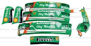 1990, Konvolut 7 Karosserieteile Porsche 964 Cup Siegerwagen Olaf Manthey, darunter rechter Kotflügel (beschädigt), mittlerer Abschnitt Stoßfänger hinten, 2x Stoßfänger hinten links, dazu 3 vordere Stoßstangen mit Kampfspuren