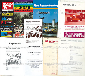 Konvolut darunter Zeitschrift „Auto Sprint“ Heft 21 (22-29.Mai.1972), mit Bericht über die Targa Florio; 4 Zeitungsausschnitte 3x mit Berichten über die Targa Florio, 1x Bericht „Dieter Schmid neuer Bergkönig“; Programmheft und Ergebnisliste 4.Int. ADAC Bergpreis Steibis 1972, u.a. Sieger Dieter Schmid auf Porsche 911 ST ((#911.230.0870) in der Klasse Serien und Spezial GT 2000ccm; Ergebnisliste Alpen-Bergpreis Berchtesgaden 02./03.06.1973, u.a. Dieter Schmid auf Porsche Carrera GTS (#119.30.000.3), weitere Ergebnisse u.a. Mieusset auf March 722, Jöst auf Porsche 908/3, Haug auf Renault Alpine...; Ergebnisliste ADAC Wallberg-Rennen 1973, Dieter Schmid 1. Klasse Gran-Turismo-Wagen 2000ccm auf Porsche 911 ST (#911.230.0870), weitere Ergebnisse u.a. Schoberth auf Porsche 911T, Abt auf Abarth 2000, Sepp Greger auf Porsche 910, Baumbauch auf Alpine A364...; Ergebnisliste Bergrennen „X Carrera en Cuesta Al Montseny“ 20.05.1973, u.a. Schmid auf Porsche 911 Carrera GTS (#119.30.000.3), weitere Ergebnisse Yves Martin auf McLaren M21, J.Fernandez auf Porsche 908/3, Claude Haldi auf Porsche 911 Carrera RSR, Gualterio auf Abarth 2000..., dazu Broschüre „Hockenheimring“