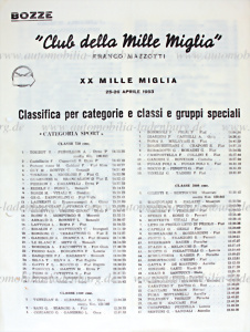 1953, Ergebnisliste XX. Mille Miglia nach Kategorie, Klassen und spezielle Gruppen, u.a. Marzotto / Crosara auf Ferrari 340MM Vignale Spyder (0280AM); Pagliai / Parducci auf Alfa Romeo 1900Ti; Mancini / Mancini auf Fiat 1100; von Hoesch / Engel auf Porsche 356 1500 Super..., 4 Seiten, gelocht