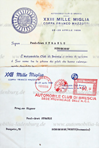 1956, original Teilnehmerurkunde für den 4. Platz in der Klasse GT 1.3, „XXIII. Mille Miglia Coppa Franco Marzotti“, Paul Ernst Strähle und Joseph „Sepp“ Greger auf Porsche 356A 1300 Super, handsigniert von Renzo Castagneto und Aymo Maggi, 22,5x15cm, inkl. Briefumschlag, Rarität