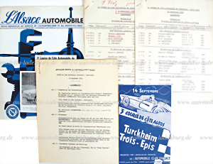 Course de Cote Turckheim Trois-Epis 1958, Konvolut 5tlg., darunter Programmheft mit handschriftlichen Eintragungen von Greger, dazu Ausschreibung 14 Seiten, zwei Ergebnislisten je 5 Seiten, sowie eine Zeitschrift L´Alsace Automobile ebenfalls mit Ergebnissen, bebildert, Greger belegte den ersten Platz in seiner Klasse und den zweiten Platz im Gesamtklassement auf Porsche 356A Carrera