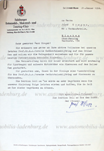 21. Januar 1956, Einladung des "Salzburger Automobil-, Motorrad- und Touring Club", betreffend Teilnahme "Professor Dr. h.c. Porsche Gedächtnisskijöring" auf dem Zeller See, dazu 4 Seiten Vorschriften, guter Zustand