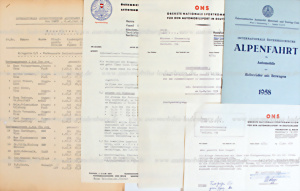 Konvolut 5tlg., "Internationale Österreichische Alpenfahrt 1958", darunter Broschüre "Besondere Vorschriften", Startgenehmigung der ONS, Bestätigung "Österreichischer Automobil- Motorrad- und Touring Club", Nennungseingang, dazu Ergebnisliste...