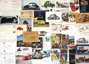 Konvolut mehr als 30tlg., Postkarten Volkswagen Käfer etc., darunter Wagenplatz Karte Urlaubsfahrt nach Norwegen 1939 rückseitig mit Werbung KDF Wagen "Wer zuerst spart fährt zuerst", 8 Werkspostkarten in Mappe 60er Jahre...etc., schönes Konvolut