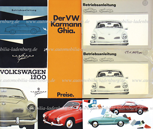 Konvolut 7tlg., Volkswagen Karmann Ghia, darunter 1957 Faltprospekt, Farbkarte, 1959 Betriebsanleitung (kleinere Beschädigung am Umschlag), Betriebsanleitung 1963, 1971, Preisliste 1972...guter Zustand